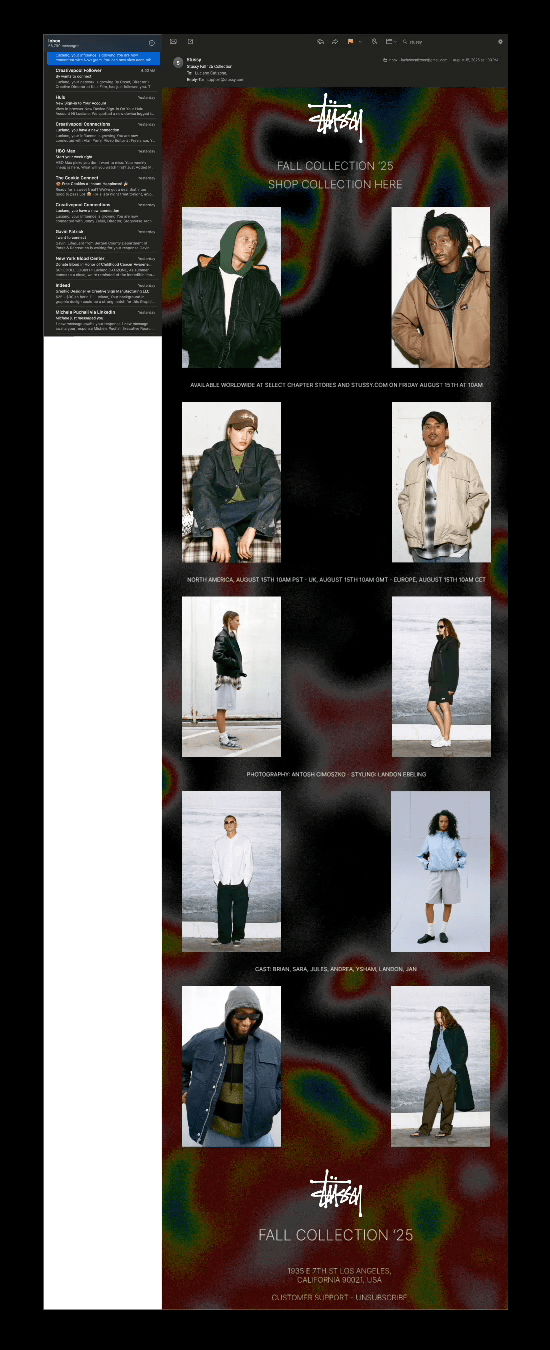 For the layout and composition of this email design I mimicked the brands "look book" sort of feel that I usually find in their promotional emails. I had previously mentioned that I wanted to try to add a dynamic element to my second email design so that is what I attempted to do with the background. I remembered recently seeing a shirt from this brand with a heat map on it so that was where the initial idea for the background came from. After deciding on going with a heat map, I wanted to make my own pattern for it so I took one of my recent pictures from my cameral roll and distorted it in photoshop using the "wave" effect. I then took that into after effects, made it move with the "turbulent displace" effect and keyframes and finally applied the color and noise with the "colorama" effect (all with the help of a instagram reel and youtube video tutorial).